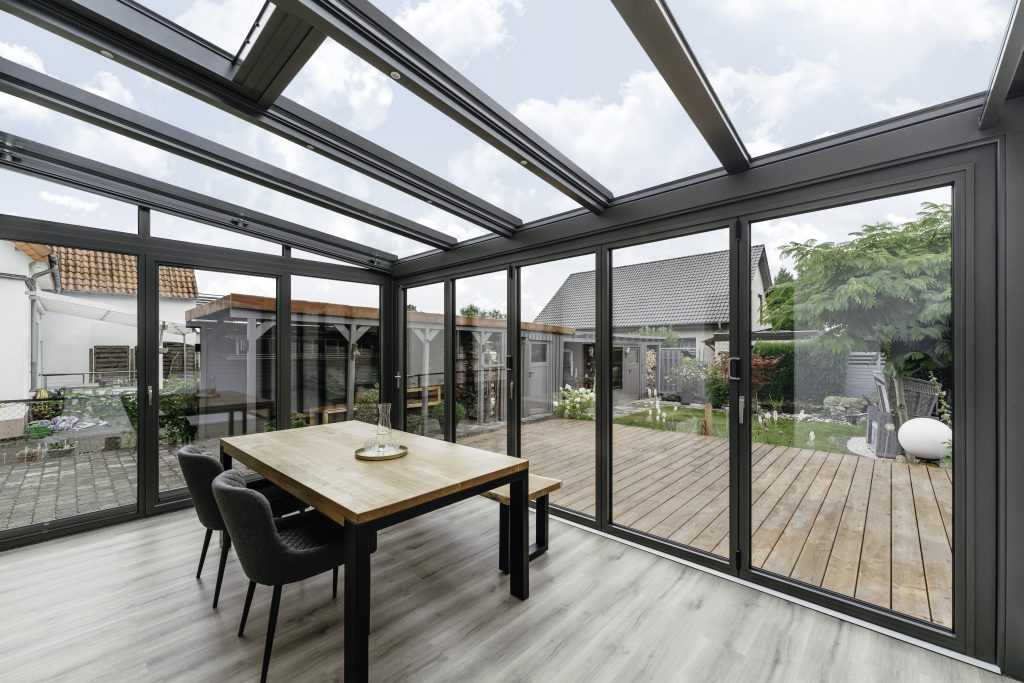 Die außen liegende Statik schafft eine ebene Dachfläche im Inneren des Wintergartens und sorgt für ein angenehmes Gefühl von Leichtigkeit. Dank fortschrittlicher Technik lassen sich auch besonders großformatige Dachkonstruktionen problemlos umsetzen. Das komplett wärmedämmte Dachsystem ermöglicht Dachneigungen von 5° bis 45°. Für eine Be- und Entlüftung können Dachlüfter mit automatischer Steuerung eingesetzt werden.