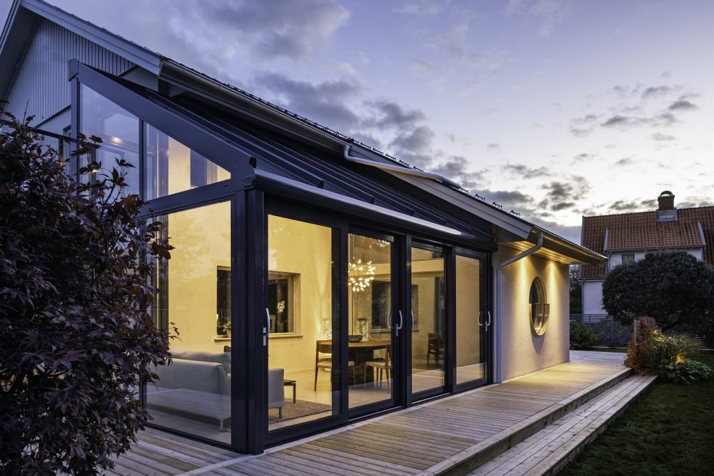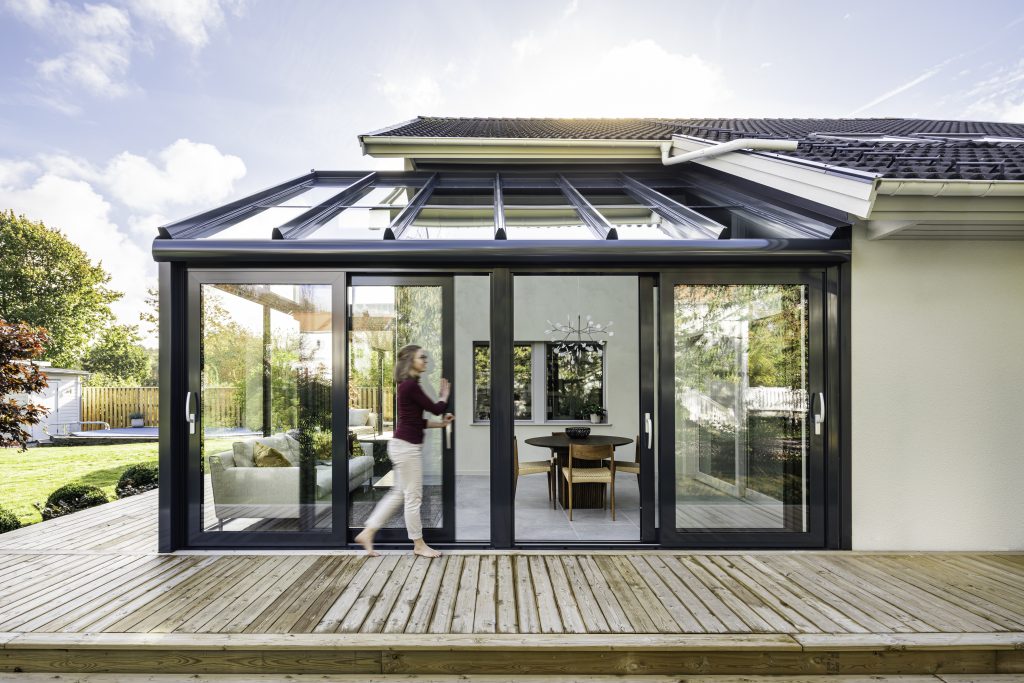 Verschiedene senkrechte Glaselemente, von einer Schiebetür oder Glas-Faltwand über ein Dreh-Kipp-Fenster bis hin zum großflächigen Schiebefenster Cero, kann mit der Dachkonstruktion kombiniert werden.