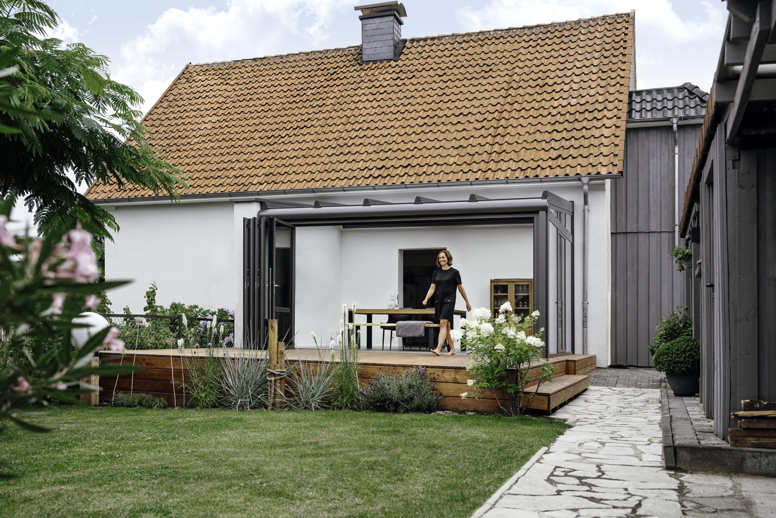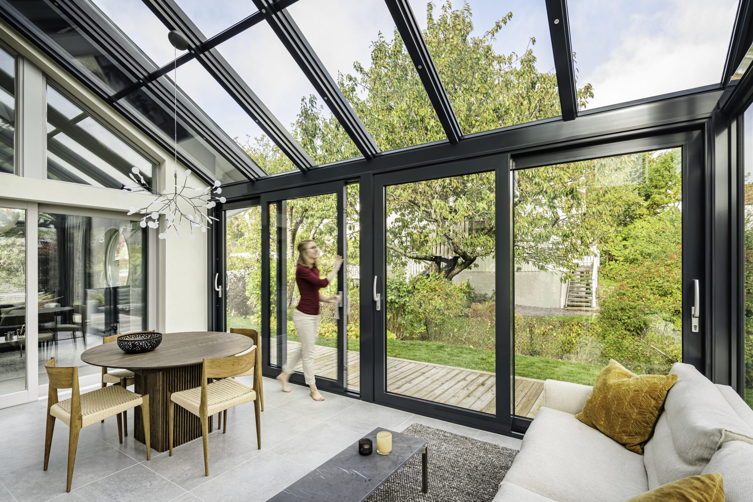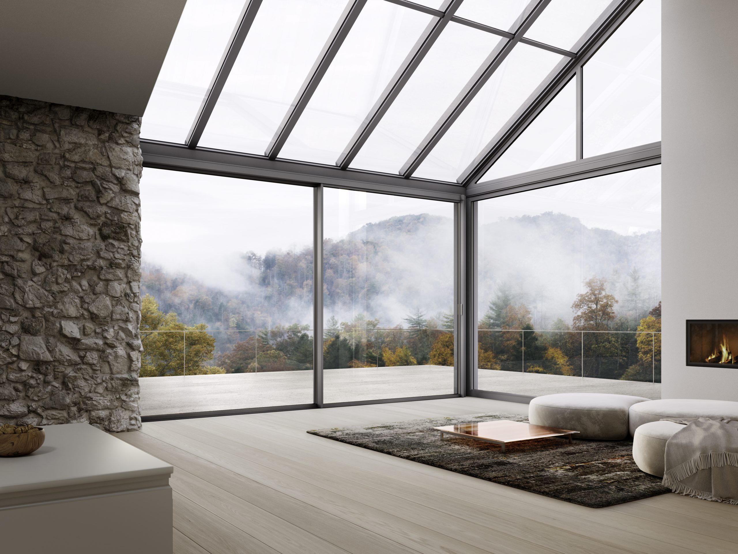 Verschiedene senkrechte Glaselemente, von einer Schiebetür oder Glas-Faltwand über ein Dreh-Kipp-Fenster bis hin zum großflächigen Schiebefenster Cero, kann mit der Dachkonstruktion kombiniert werden.