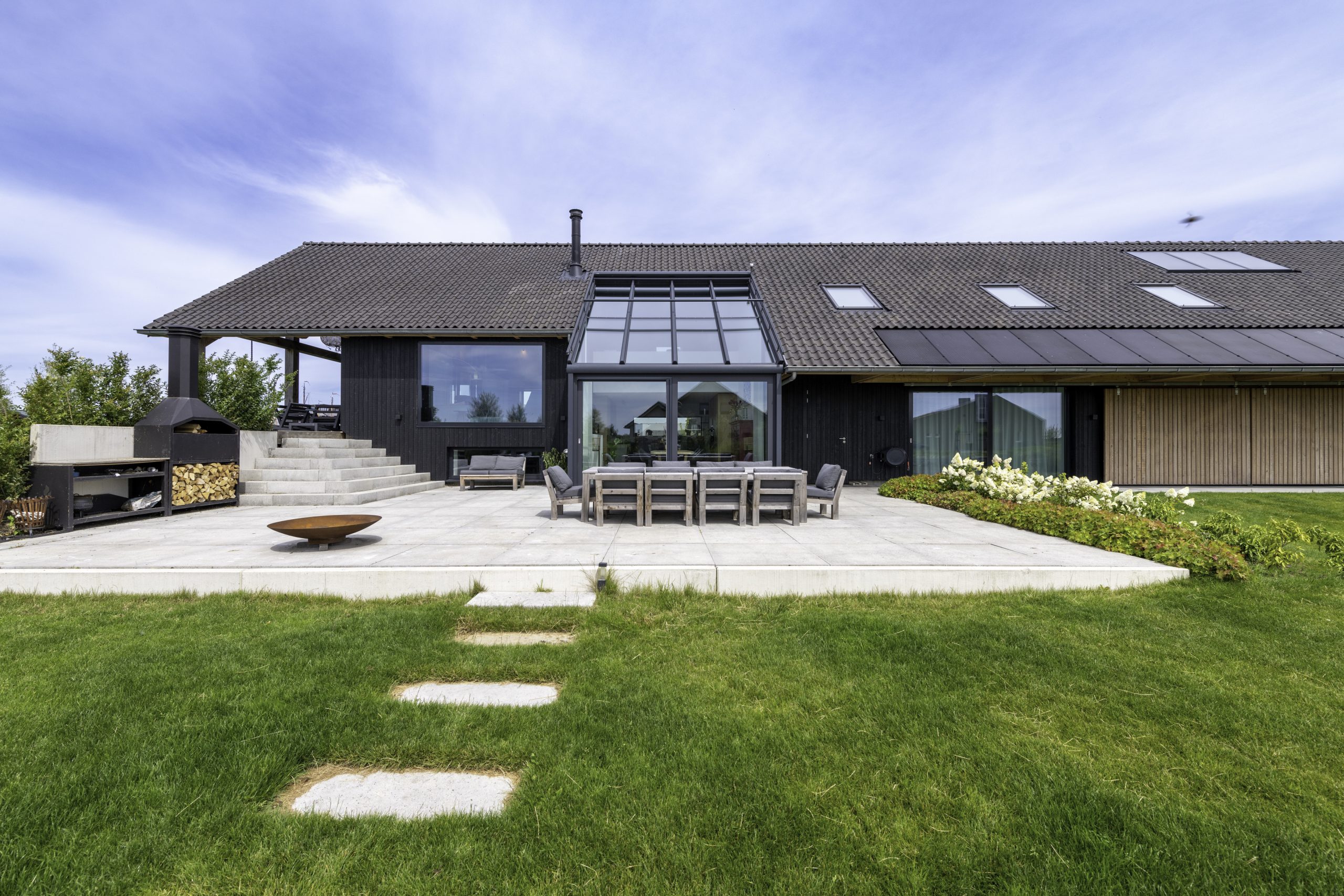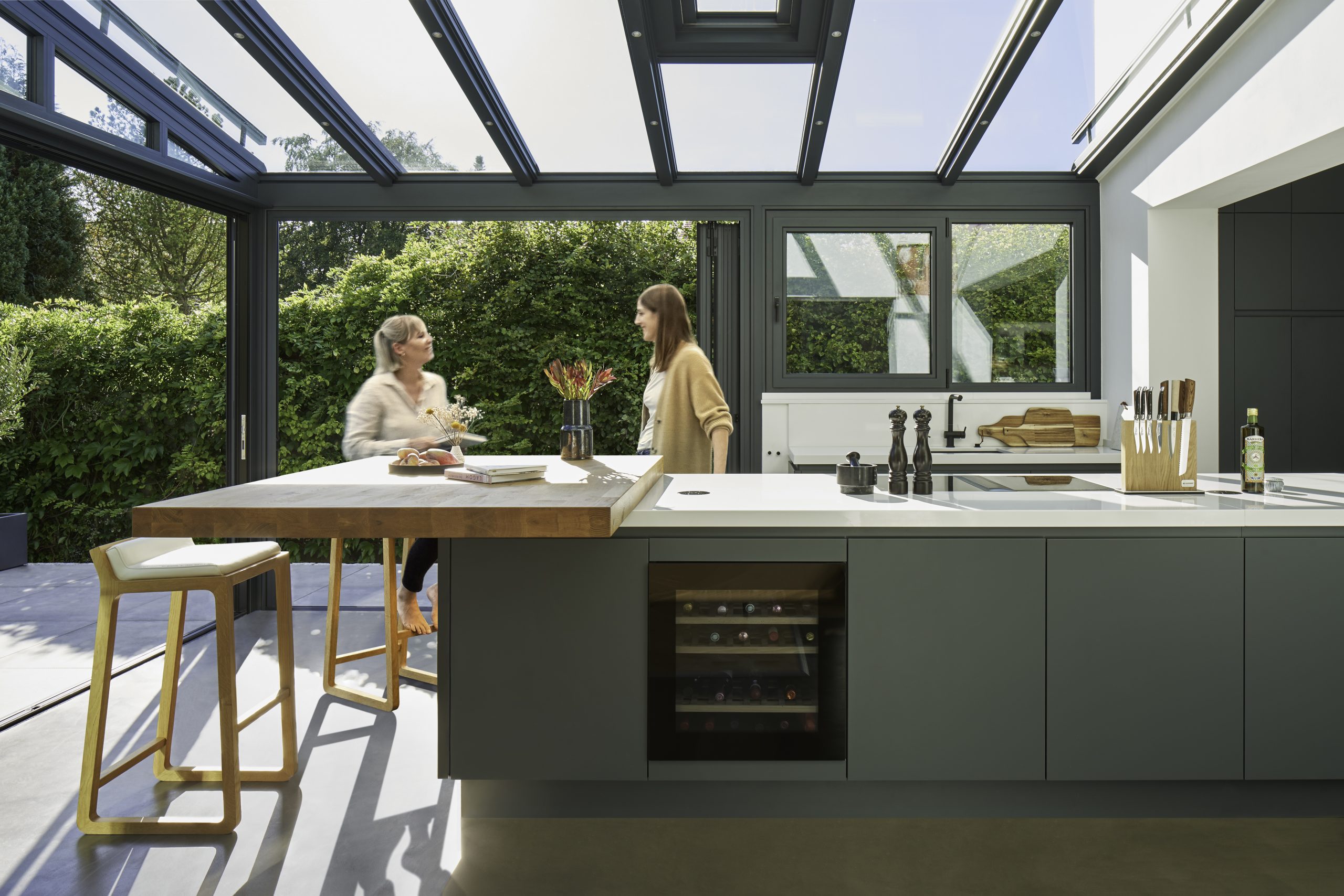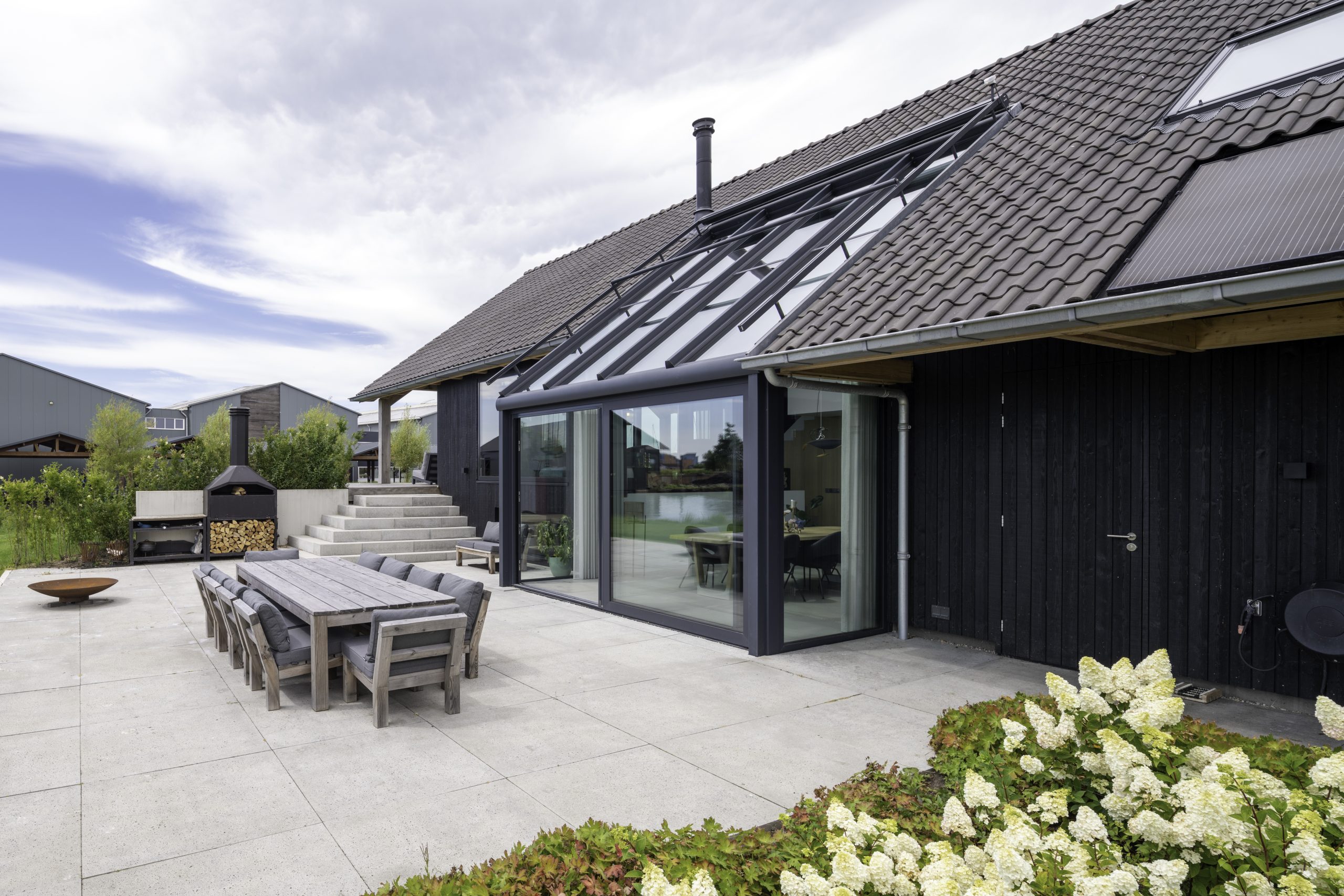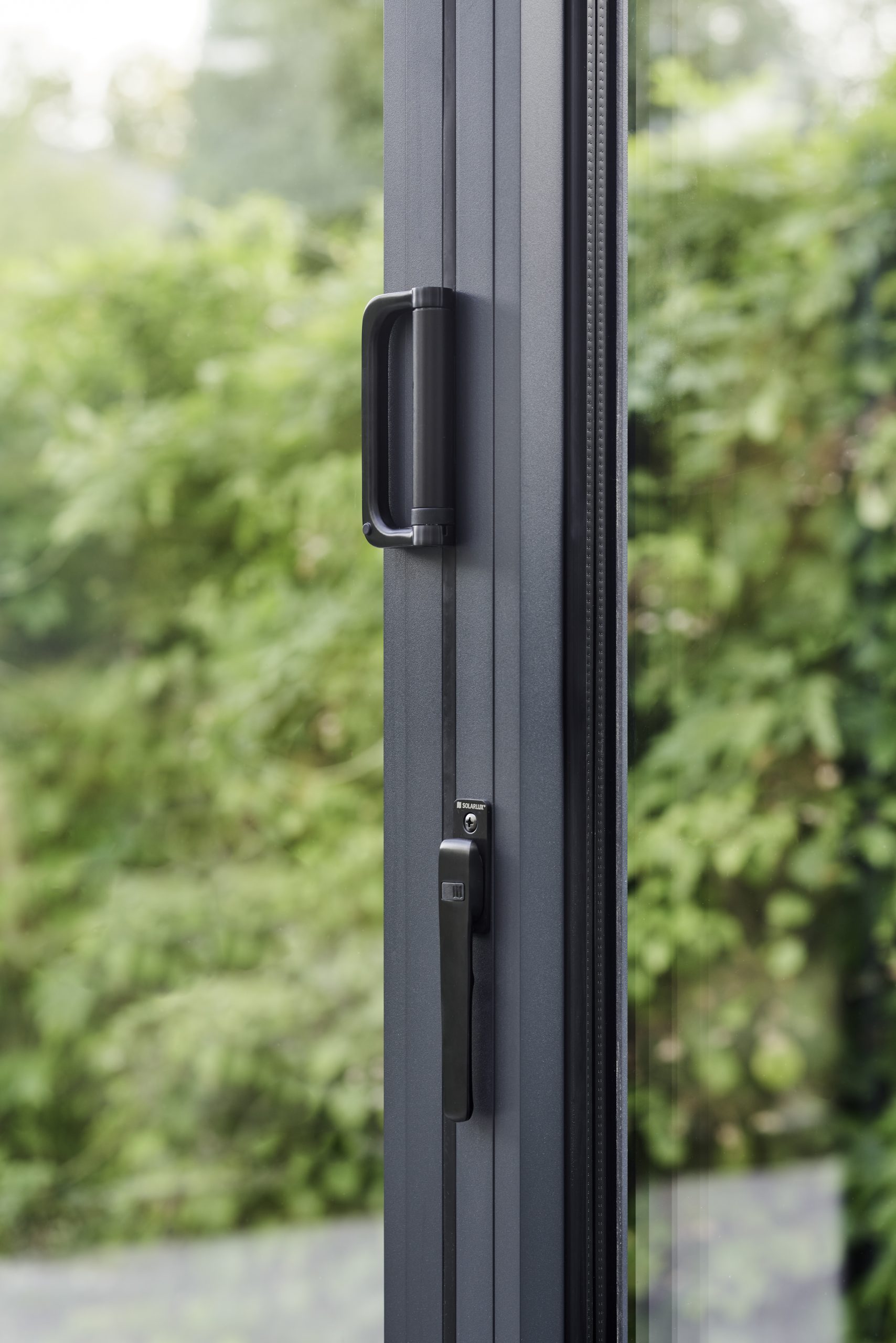 Verschiedene senkrechte Glaselemente, von einer Schiebetür oder Glas-Faltwand über ein Dreh-Kipp-Fenster bis hin zum großflächigen Schiebefenster Cero, kann mit der Dachkonstruktion kombiniert werden.