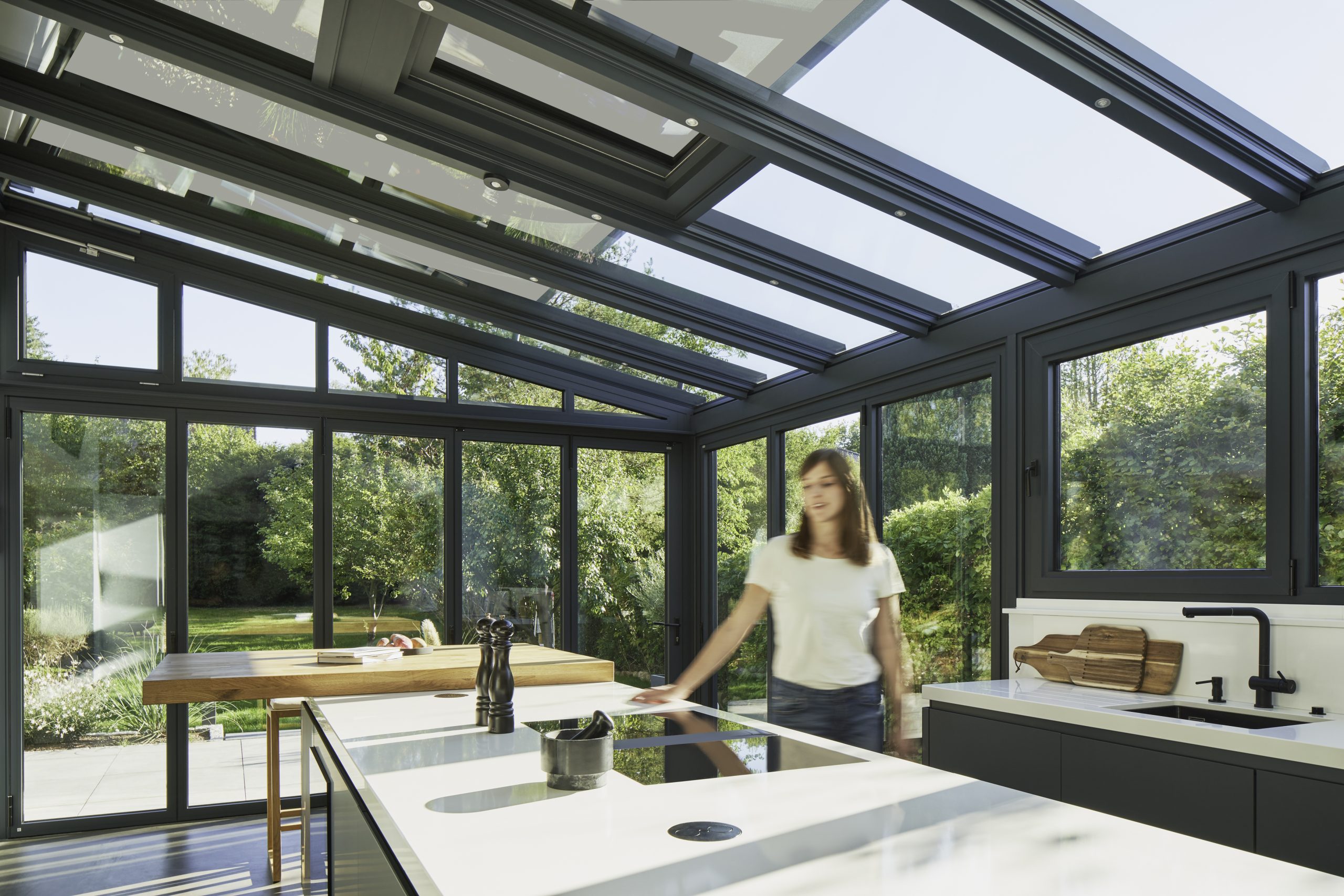 Die außen liegende Statik schafft eine ebene Dachfläche im Inneren des Wintergartens und sorgt für ein angenehmes Gefühl von Leichtigkeit. Dank fortschrittlicher Technik lassen sich auch besonders großformatige Dachkonstruktionen problemlos umsetzen. Das komplett wärmedämmte Dachsystem ermöglicht Dachneigungen von 5° bis 45°. Für eine Be- und Entlüftung können Dachlüfter mit automatischer Steuerung eingesetzt werden.